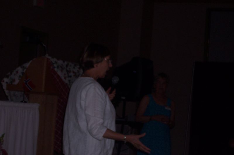 Solveig (Leraas) Nelson and Judith (Leraas) Cook show slides of their trip to the family farm at the Leiro Gaard in Norway.